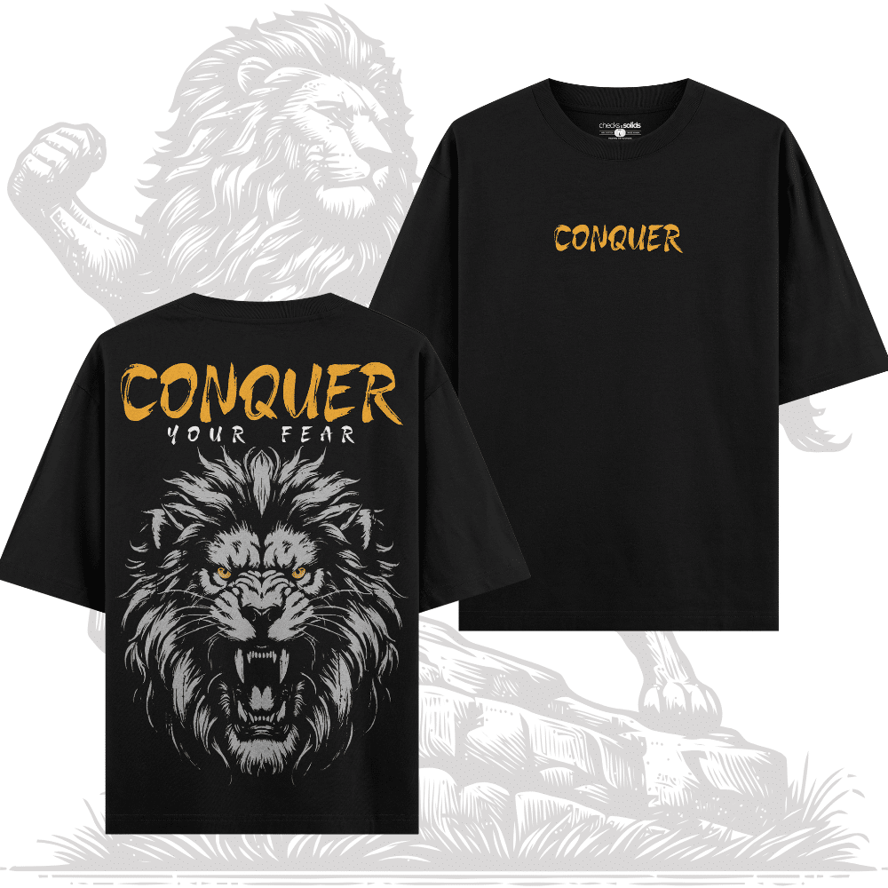 oversized lion t-shirt, black conquer t-shirt, streetwear lion print, conquer your fear shirt, motivational graphic tee, men’s oversized t-shirt cotton, checks and solids t-shirts