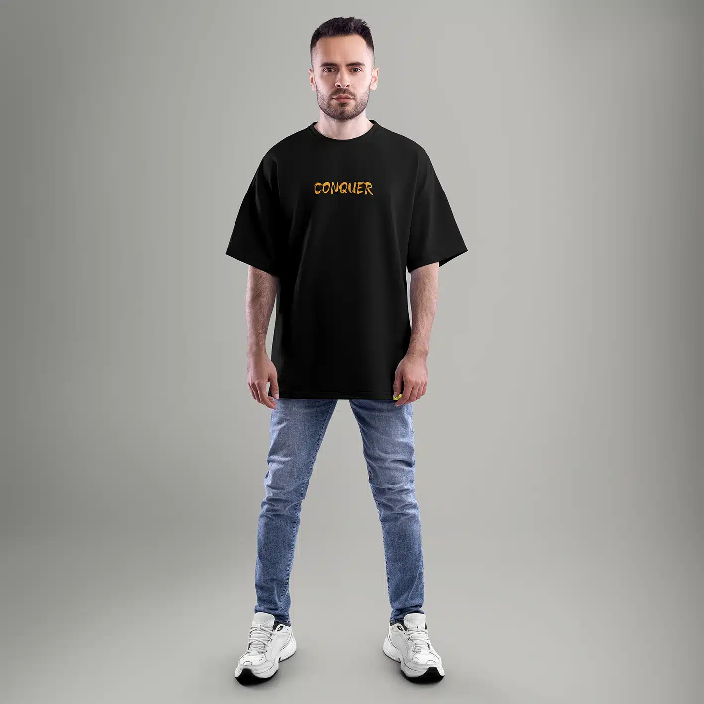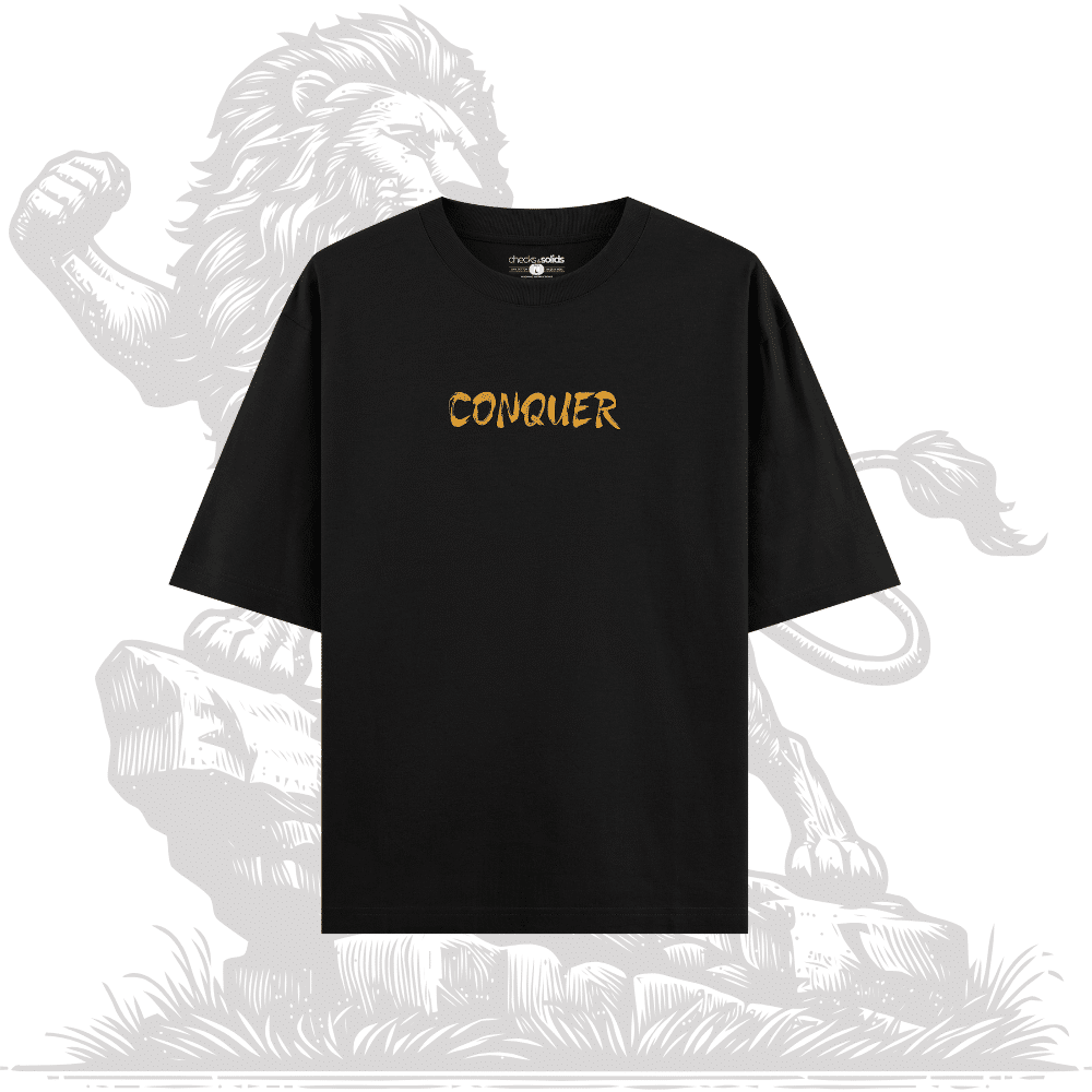 Unleash your inner beast with the “Conquer Your Fear” oversized T-shirt from Checks and Solids. Crafted from premium 100% cotton, this bold black tee features a roaring lion graphic on the back — a symbol of courage, strength, and fearless energy. The front showcases a minimal “CONQUER” print in striking yellow-orange tones for a powerful yet clean streetwear statement.