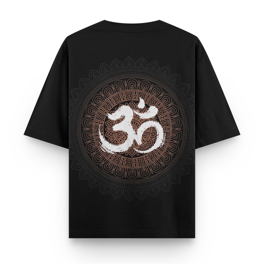 Premium oversized t-shirt, Om mandala design, spiritual streetwear, black oversized tee, Checks & Solids.
