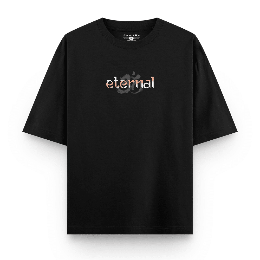 Elevate your streetwear game with the Checks & Solids “Eternal” Oversized T-Shirt. Crafted from premium 240 GSM cotton for unmatched comfort and durability, this black oversized tee blends minimal style with spiritual depth.