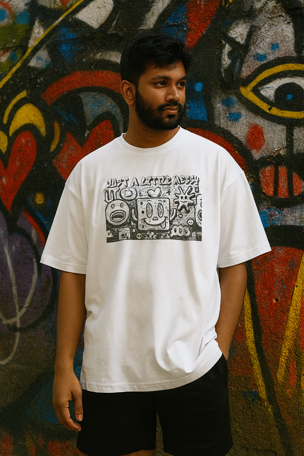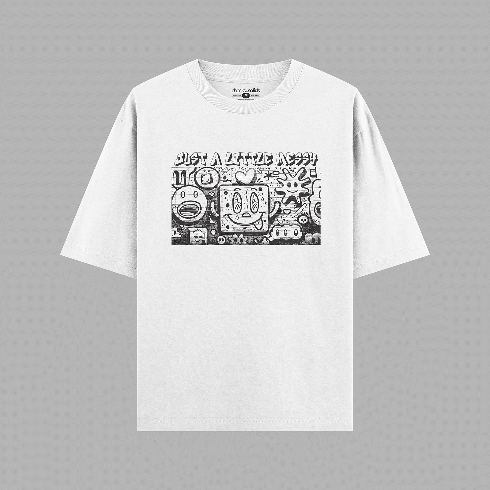 Bring bold creativity to your wardrobe with the Just a Little Messy Oversized White T-Shirt from Checks & Solids. This premium cotton tee showcases a striking black-and-white graffiti-style graphic filled with quirky doodles and expressive characters, topped with the playful phrase “Just a Little Messy.”