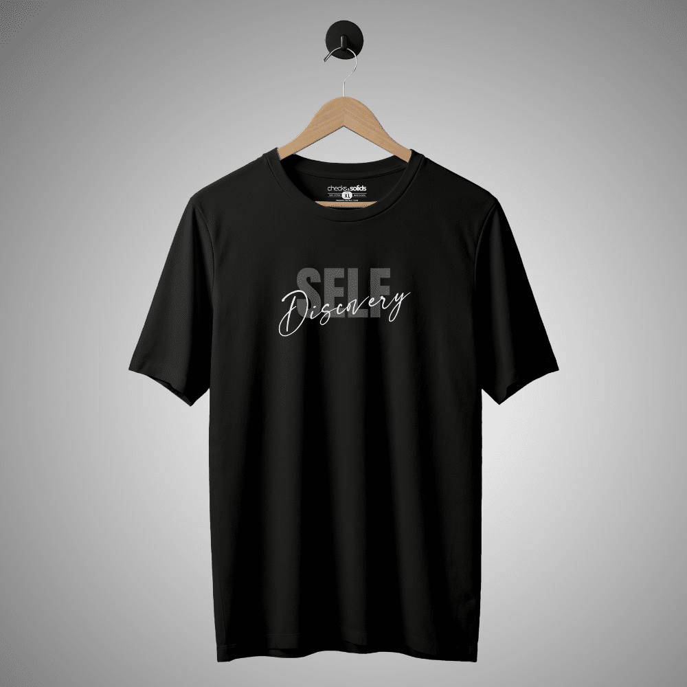 Find your style and comfort with the Self Discovery black T-shirt, crafted from 180 GSM premium fabric. Made using 100% cotton and bio-washed for extra softness, this regular fit tee offers durability, breathability, and a smooth finish. Perfect for casual outings or everyday wear, it blends minimal design with meaningful expression. A versatile must-have from Checks & Solids for men and women.
