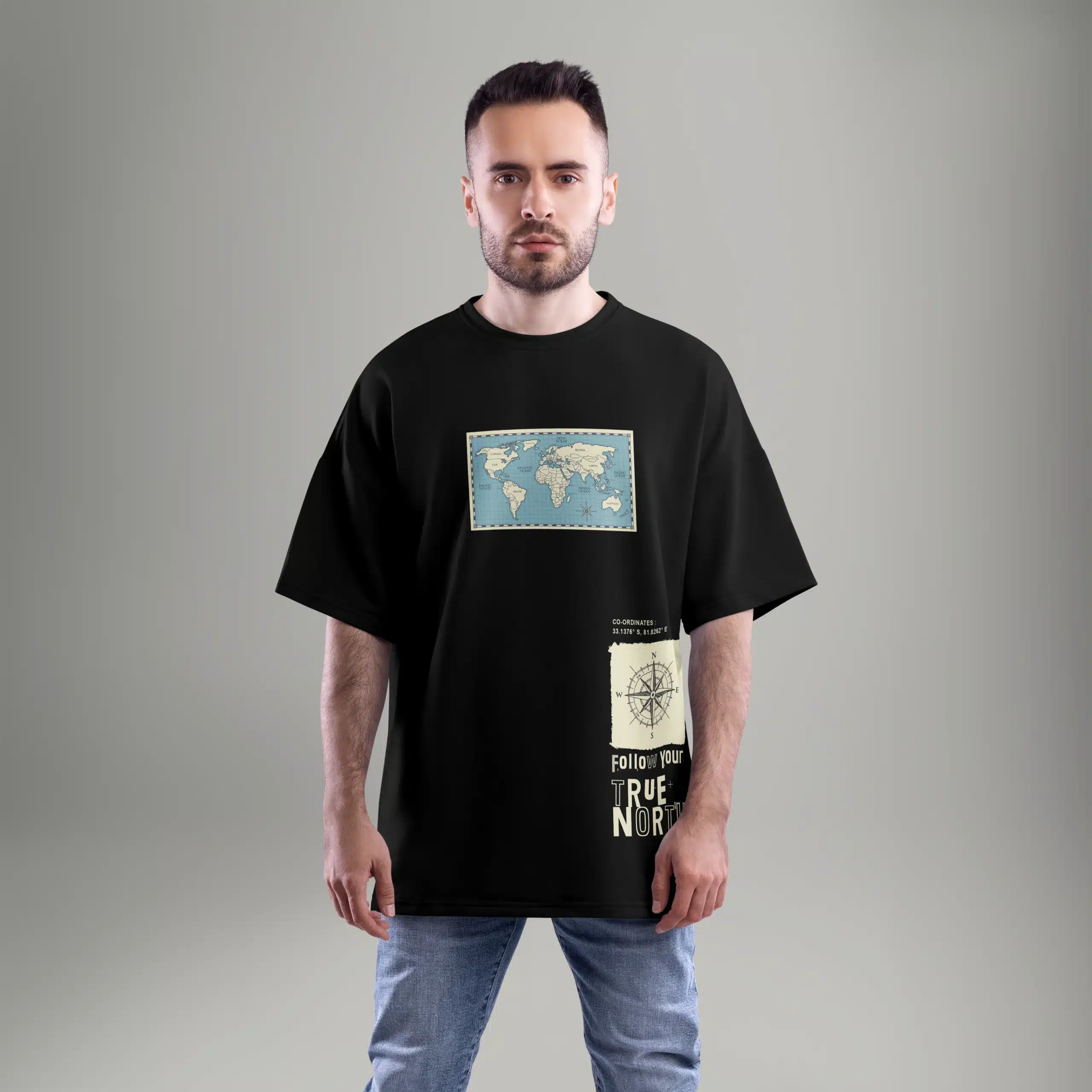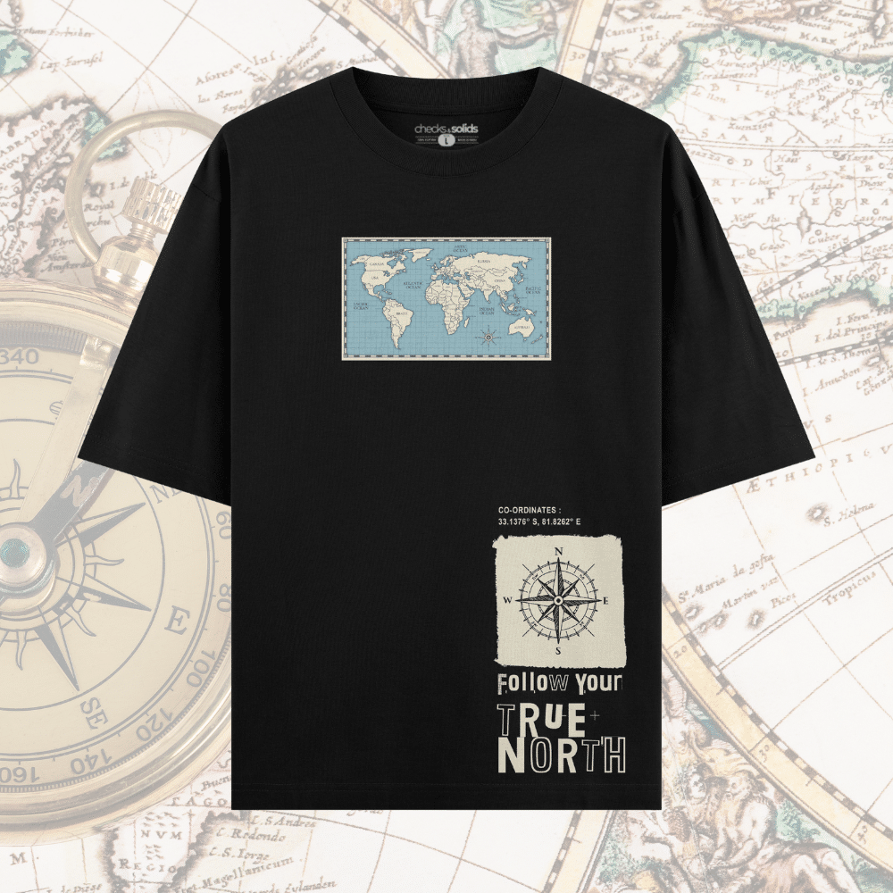 “True North” Oversized Map & Compass T-Shirt – Black | 100% Cotton | Unisex Streetwear